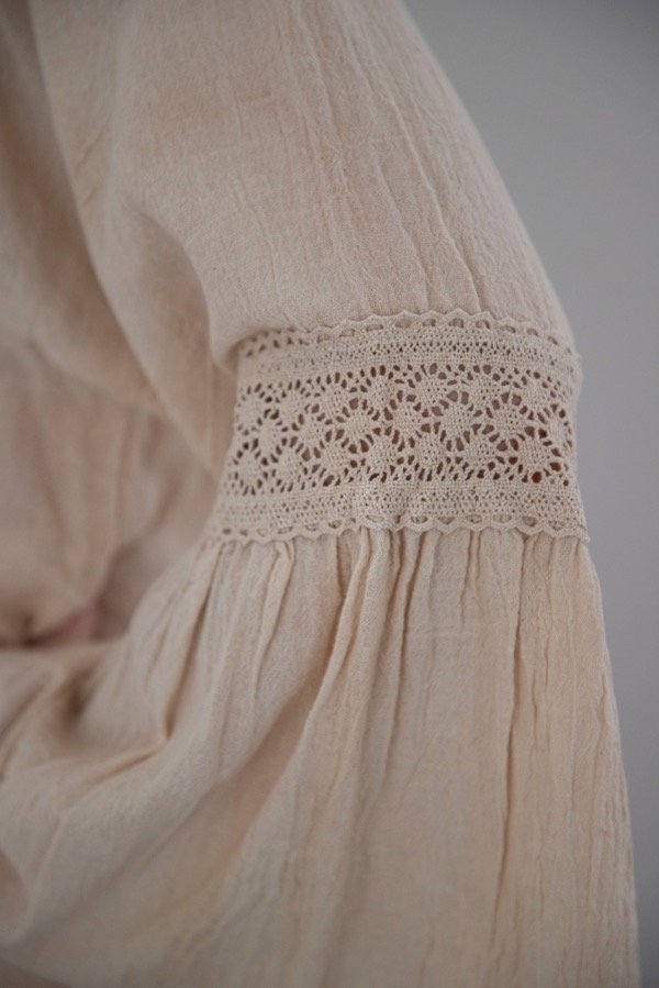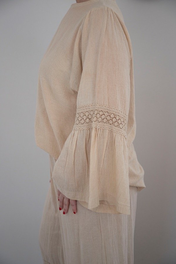 Blusa amplia de gasa pesada premium con detalles de puntilla y bolados en las mangas.
