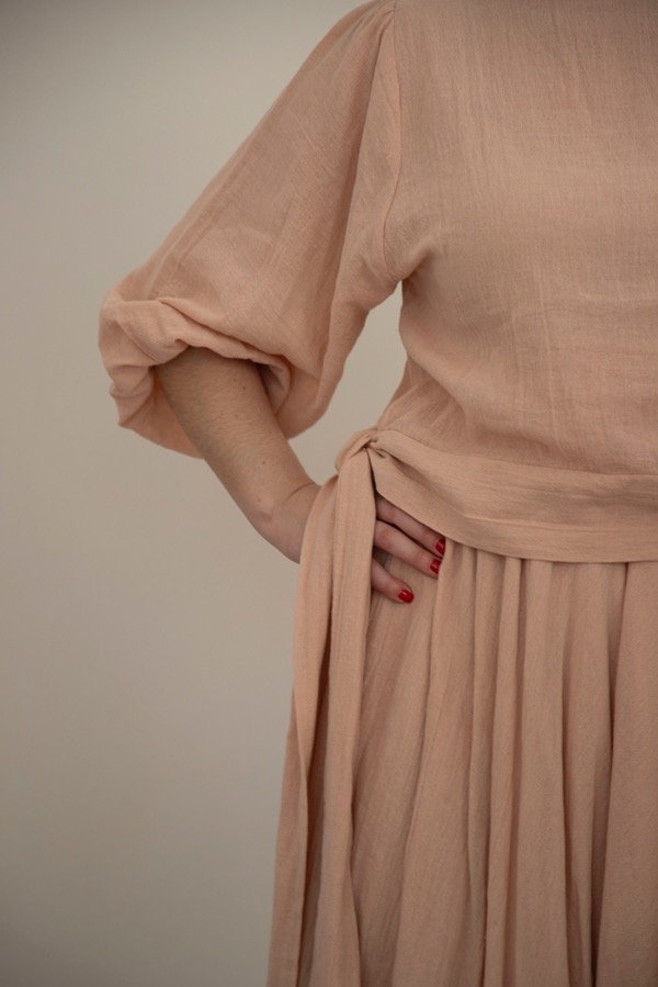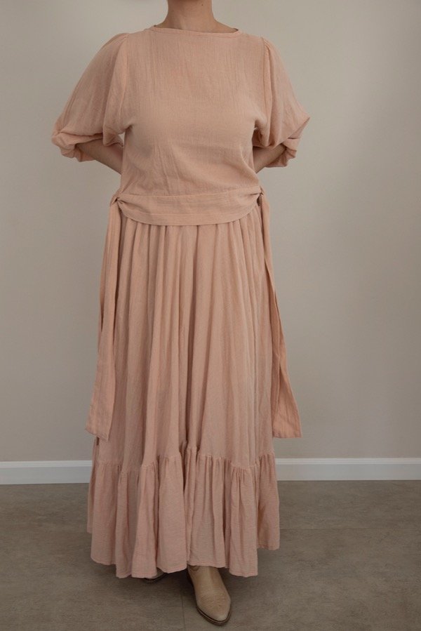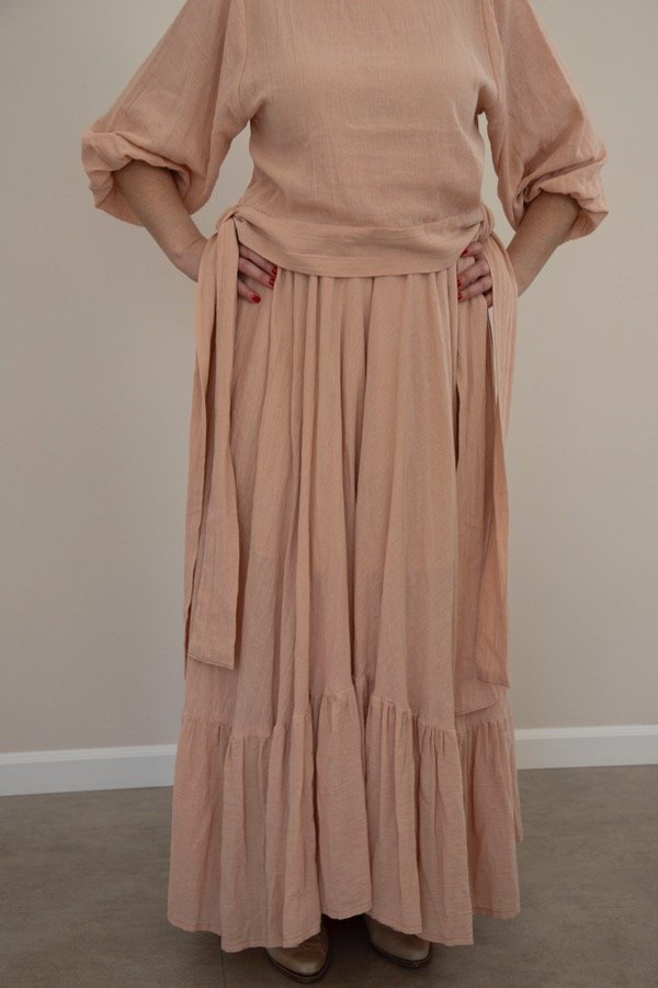 Falda media campana + Blusa con lazo realizado en gasa arrugada premium.