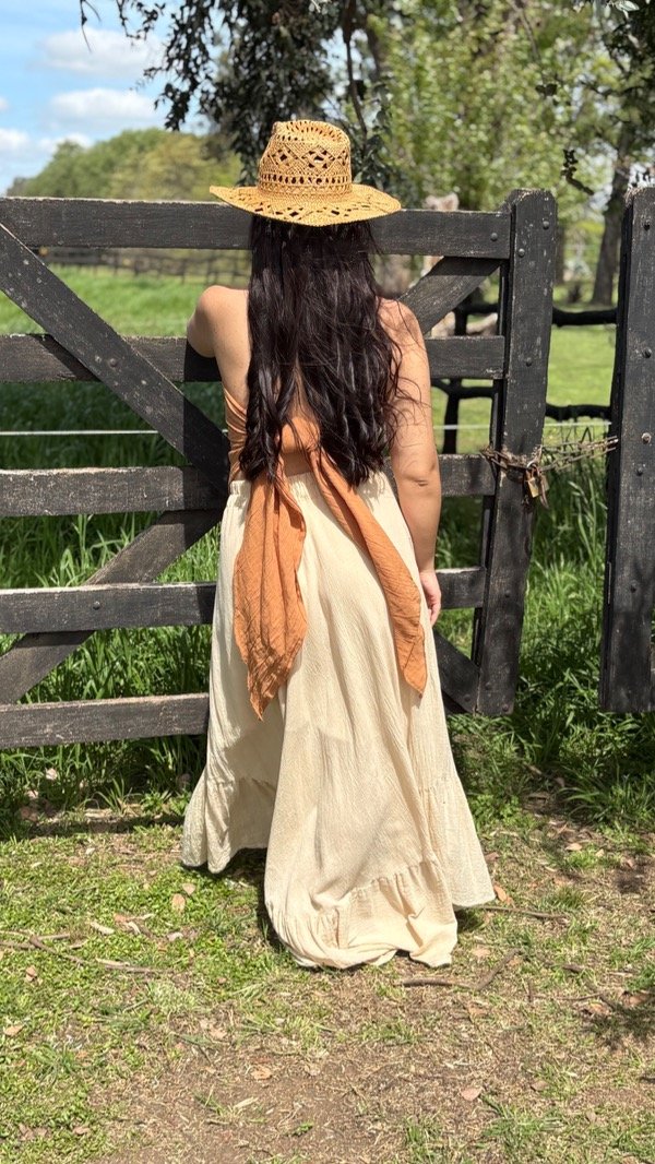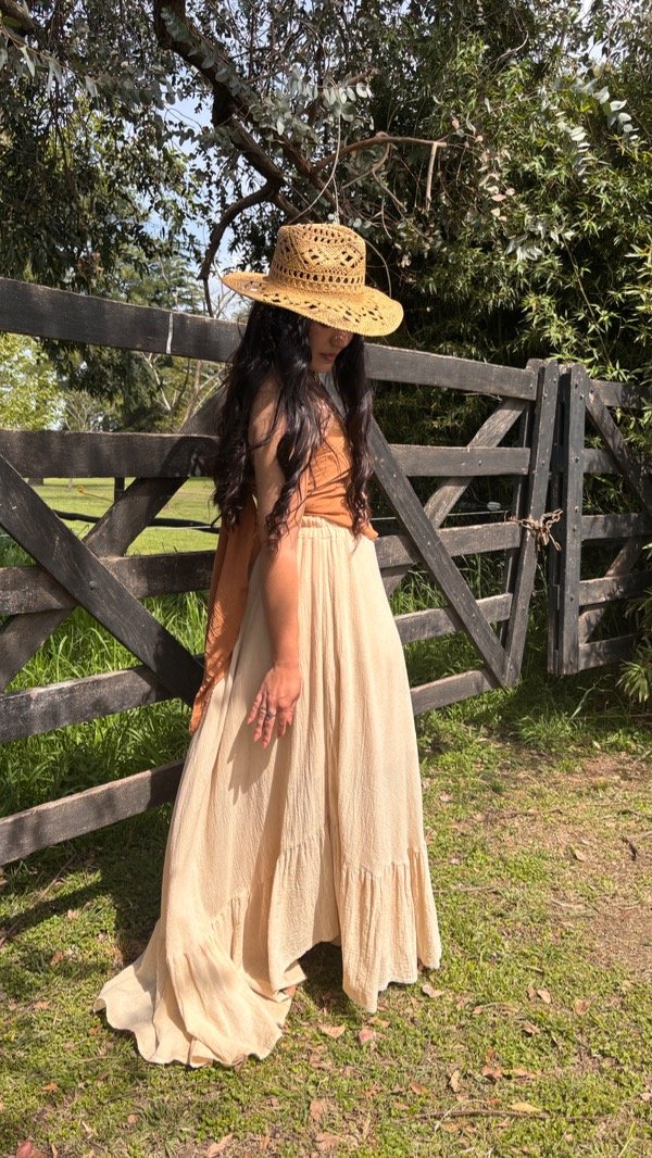 Falda media campana de largo irregular, confeccionada en gasa natural.