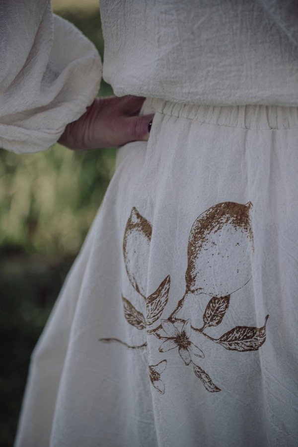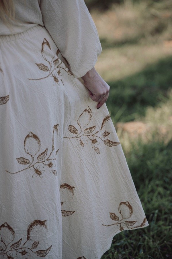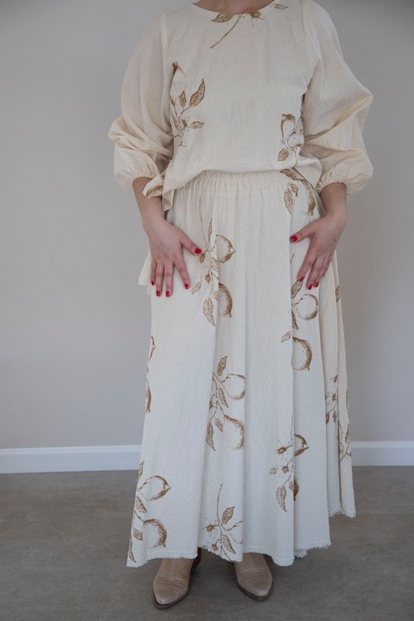 Falda media campana, largo irregular y elástico en cintura, realizada en tela natural con serigrafía.